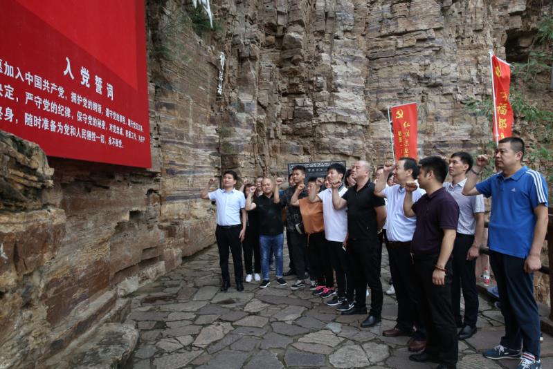 在參觀紅旗渠咽喉工程青年洞前,鄭州市膏藥協(xié)會(huì)黨支部全體黨員在鮮紅的黨旗面前莊嚴(yán)宣誓,重溫入黨誓詞,堅(jiān)定了作為一名共產(chǎn)黨員的精神追求和為黨的事業(yè)奮斗終生的信仰。時(shí)空流轉(zhuǎn),多少人的生命與汗水,凝結(jié)成蜿蜒的巨龍穿山而來,鐫刻在崖壁上的是永不服輸?shù)募t旗渠精神。